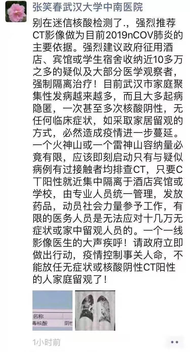 “老百姓认知有限,无法做到真正的医学隔离。”,武汉大学中南医院医生张笑春在其个人微信朋友圈里也指出,不应迷信核酸检测,强烈推荐CT影像作为目前新冠病毒感染肺炎的主要依据。