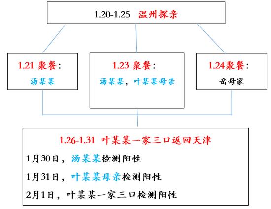在现场,张颖又分析了本市第39、40、41例确诊病例的感染过程。“叶某某一家三口情况比较简单,但是也具有警示作用。他们是温州人,日常生活、工作在天津,1月20日回温州老家探亲。20-25日期间,他们参加了3次聚会:第一次聚餐在21日,汤某某参与;23日,汤某某与叶某某的母亲共同参与;24日叶某某在岳母家聚餐。30日,汤某某被温州当地确诊为新型冠状病毒感染的肺炎病例,31日,叶某某的母亲被检测是阳性,同样被确诊。到了2月1日,叶某某一家三口全部被确诊为新型冠状病毒感染的肺炎病例。都是聚餐惹的祸。”