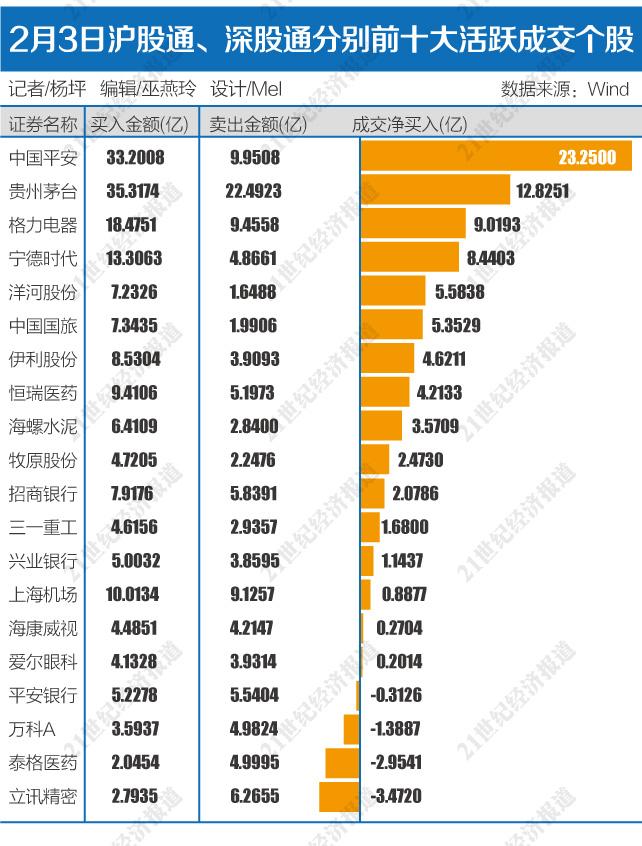 沪股通中,十大活跃个股分别是贵州茅台、中国平安、上海机场、恒瑞医药、招商银行、伊利股份、中国国旅、海螺水泥、兴业银行和三一重工,净买入额均为正。其中,净买入额排在前三位的是中国平安、贵州茅台和中国国旅,获得净买入23.25亿元、12.83亿元、5.35亿元。