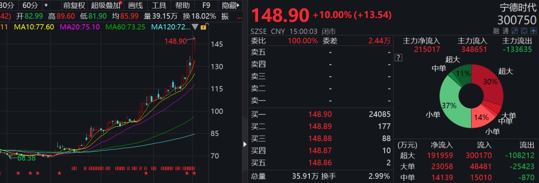 其中,市场今日最亮的仔要数创业板宁德时代了。
