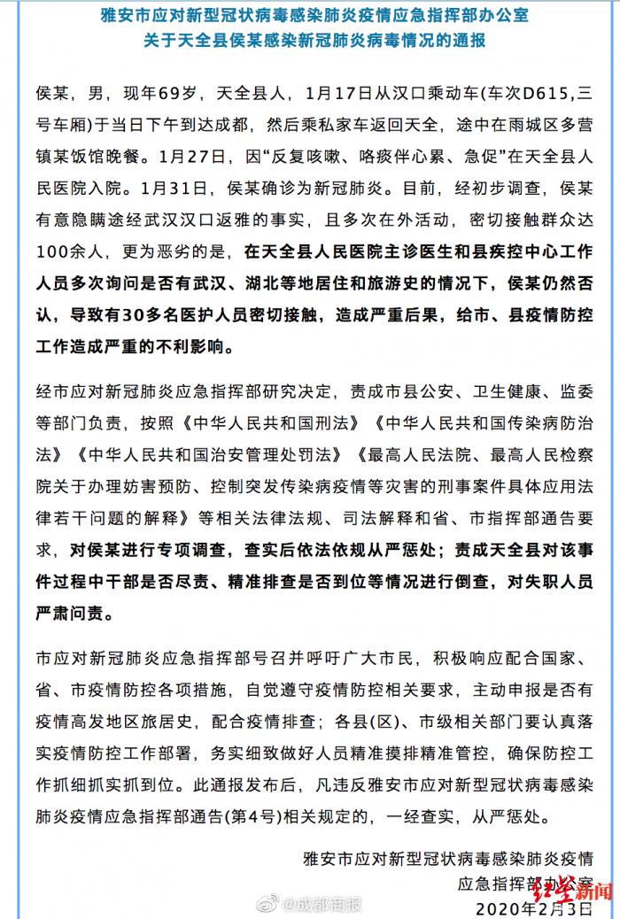 侯某,男,现年69岁,天全县人,1月17日从汉口乘动车(车次D615,3号车厢)于当日下午到达成都,然后乘私家车返回天全,途中在雨城区多营镇某饭馆晚餐。1月27日,因“反复咳嗽、咯痰伴心累、急促”在天全县人民医院入院。1月31日,侯某确诊为新冠肺炎。目前,经初步调查,侯某有意隐瞒途经武汉汉口返雅的事实,且多次在外活动,密切接触群众达100余人,更为恶劣的是,在天全县人民医院主诊医生和县疾控中心工作人员多次询问是否有武汉、湖北等地居住和旅游史的情况下,侯某仍然否认,导致有30多名医护人员密切接触,造成严重后果,给市、县疫情防控工作造成严重的不利影响。