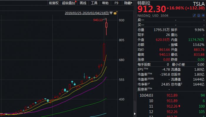 在2月3日取得19.89%的涨幅后,2月4日美股盘前特斯拉再次上涨逾15%。至发稿前,该公司股价涨幅不断扩大,股价突破900美元,盘中最大涨幅达到20.53%。