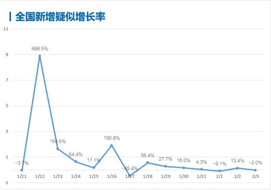 全国疫情趋势图显示,每日新增确诊病例和疑似病例的绝对数仍在上涨,但增长率继续保持下降趋势,增速创疫情爆发以来新低,而评估疫情扩散速度的新增疑似增长率更是出现了负增长。