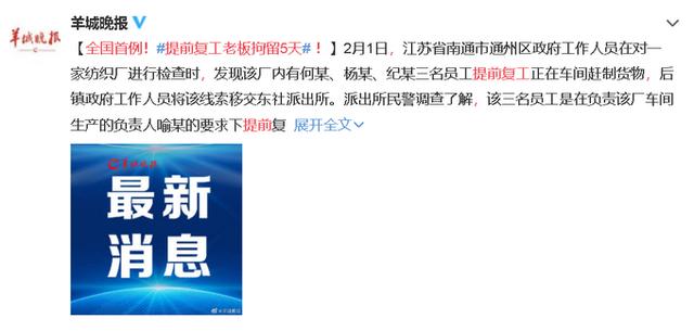 这也是全国首例因为提前复工,被行政拘留的案例。