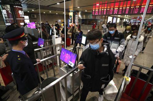 2月2日,旅客在北京西站出站口通过红外测温仪。-中新社