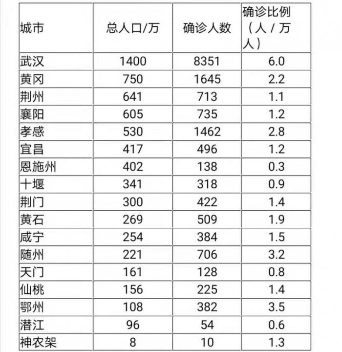 从湖北省各市确诊人数占总人口数的比例中,随州市确诊病例总数虽小于湖北、黄冈、孝感,但每一万居民中,就有3.2人确诊感染新型冠状病,远大于黄冈市的2.2人/万人和孝感市的2.8人/万人,仅次于武汉市的4.6/万人和鄂州市的3.5/万人。