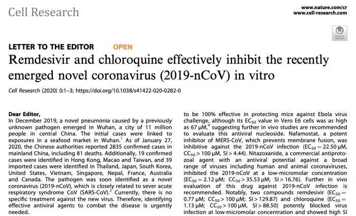 相关研究成果以“Remdesivir and chloroquine effectively inhibit the recently emerged novel coronavirus (2019-nCoV) in vitro”(《瑞得西韦和磷酸氯喹能在体外有效抑制新型冠状病毒(2019-nCoV)》)为题发表在中国自主知识产权的国际知名学术期刊Cell Research(《细胞研究》)上。