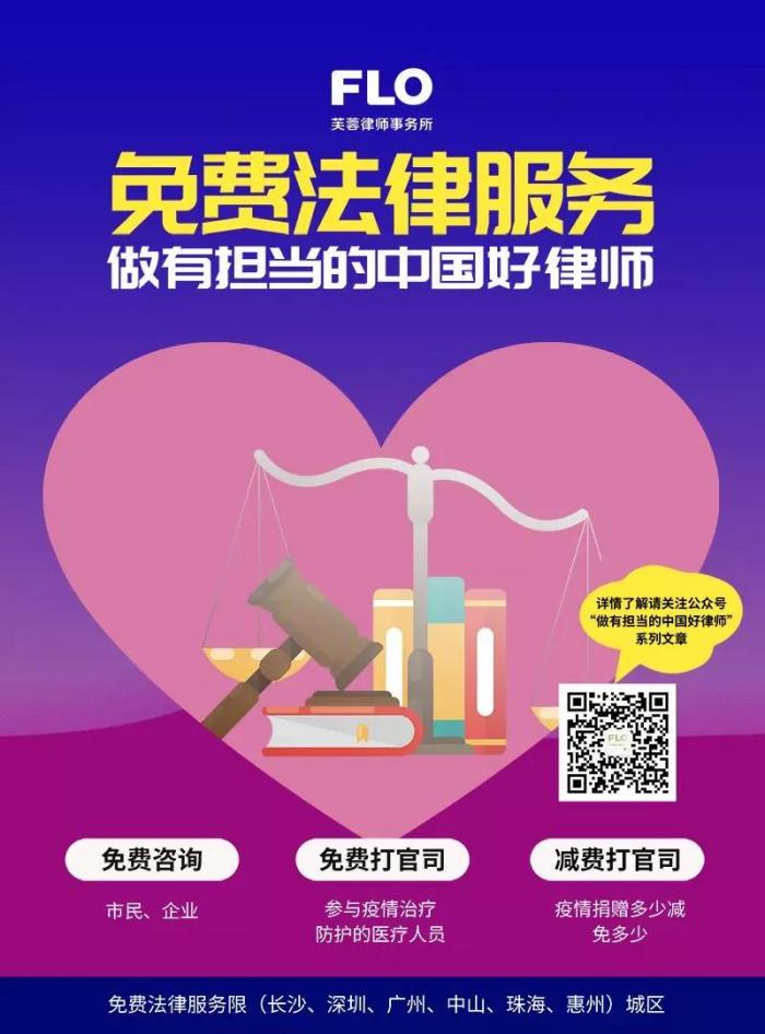 继2月1日,芙蓉律师事务所律所宣布将面向社会(长沙市范围内)提供免费法律服务并面向全所招募志愿者的工作安排之后,芙蓉律所广州办公室积极响应“做有担当的中国好律师”的芙蓉公益号召,并结合广州市疫情防控情况与律所工作实际,于2月4日宣布了相关工作安排。将于2月4日起面向社会(限广州市内)提供免费法律服务(截止至2020年12月31日)。具体包括: