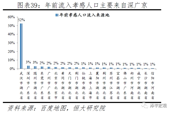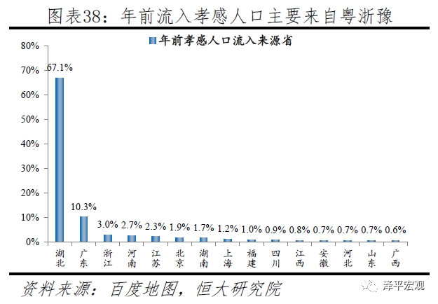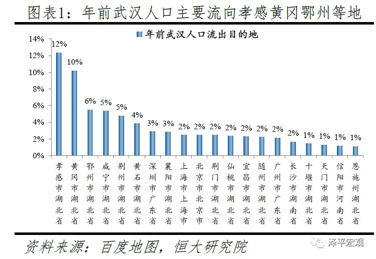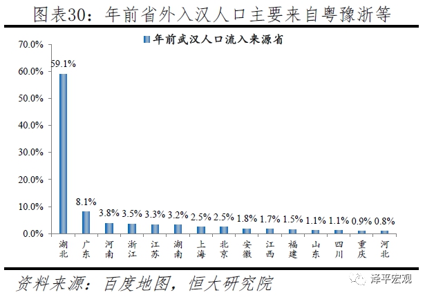 武汉是新型冠状病毒肺炎的发源地,未来流出武汉的返工人口流向是关注的重中之重。武汉户籍人口占湖北省约1/7,且武汉户籍人口外出务工比例应低于湖北其他地区,在封城状态下当前武汉有人口约900万,年后武汉人口流出规模应在几十万规模。
