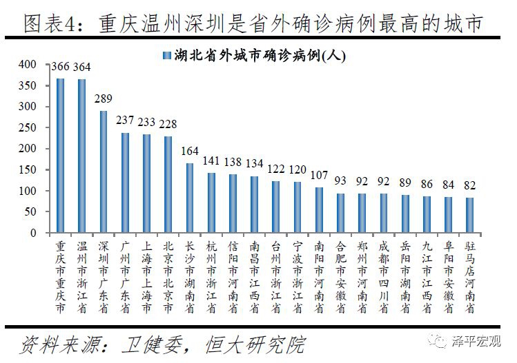 2)节前流出湖北的人口中55%流向河南、湖南、重庆、江西、广东5省,47%流向重庆、南阳、信阳、九江、长沙等20城;这与浙江、广东、河南、湖南、江西5省确诊案例居前、合计占全国的15%,重庆、温州、深圳、广州、上海、北京等10城确诊案例居前、合计占9%等大致对应。