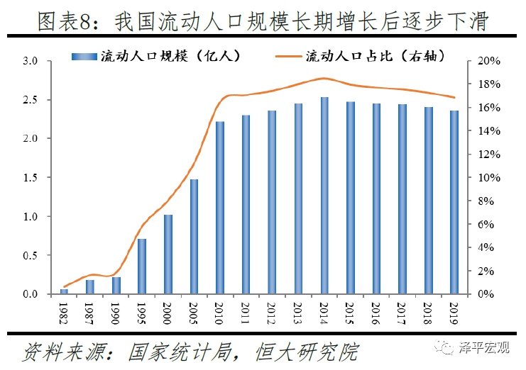 这表明一二线城市常住人口流入放缓但仍保持集聚,三四线人口持续净流出。2018年一线、二线、三线、四线城市经济-人口比值分别为2.3、1.6、1.0、0.6,这预示着未来人口将继续向少数地区、向大城市大都市圈集聚。由于户籍制度限制及“过年回家”情结,中国春运呈现显著“钟摆式流动”特征,即年前停工回乡、节后返城复工,此外部分城市存在“反向春运”现象,每年春节前后出现人次约30亿级的大规模人口流动。中国流动人口规模在2014年达2.53亿的峰值,2019年降至2.36亿人,其中主要为外出农民工,2019年达1.74亿人;与流动人口情况对应,2014-2019年春运发送旅客数量从36.2亿人次下降为29.8亿人次。