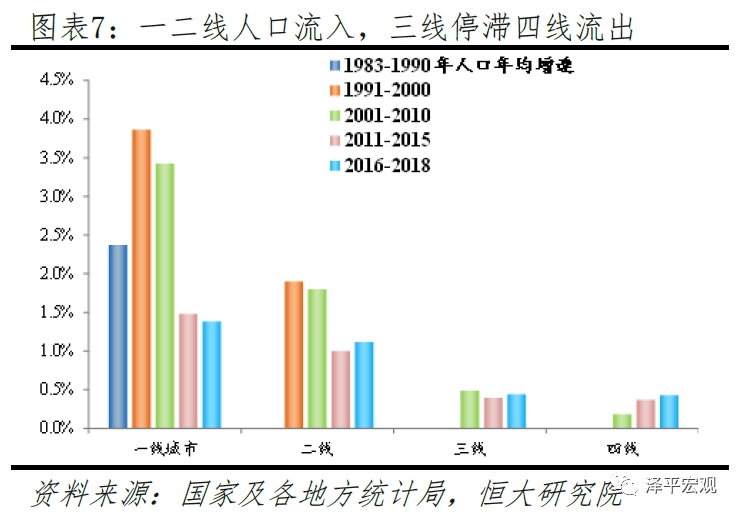 1991-2000年、2001-2010年、2011-2015年、2016-2018年期间,一线城市人口年均增速分别为3.9%、3.4%、1.5%、1.4%,二线城市分别为1.9%、1.8%、1.0%、1.1%,三四线合计人口年均增速分别为0.63%、0.37%、0.30%、0.27%,全国人口平均增速为1.04%、0.57%、0.50%、0.50%(由于统计上各地区人口加总不等于全国,三四线合计人口为全国剔除一二线得到,与三线、四线人口不完全吻合)。