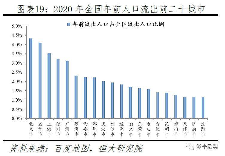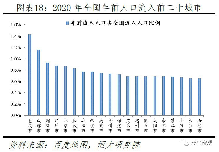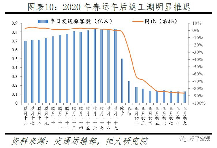 1)疫情影响下节后返工潮明显推迟。人口迁移的基本逻辑是人随产业走、人往高处走,中国人口长期持续向大城市大都市圈集聚,每年春节前后出现规模约30亿人次的“回乡潮”和“返工潮”。2020年春节回乡潮较往年提前,但受疫情影响节后返工潮明显推迟,正月初一至初九客运量合计1.41亿人次,同比减少78%,预计节后返城高峰将在2月8-9日前后开始出现。