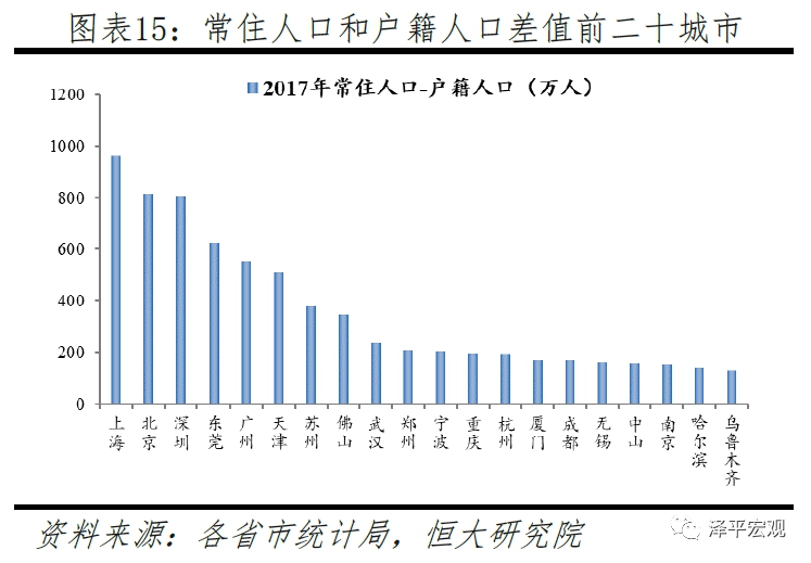 在城市层面,2017年一线、二线城市、三四线城市常住人口与户籍人口的差值为3134万、4991万、-7717万,其中上海、深圳、北京、东莞、广州等地外来人口均超500万。