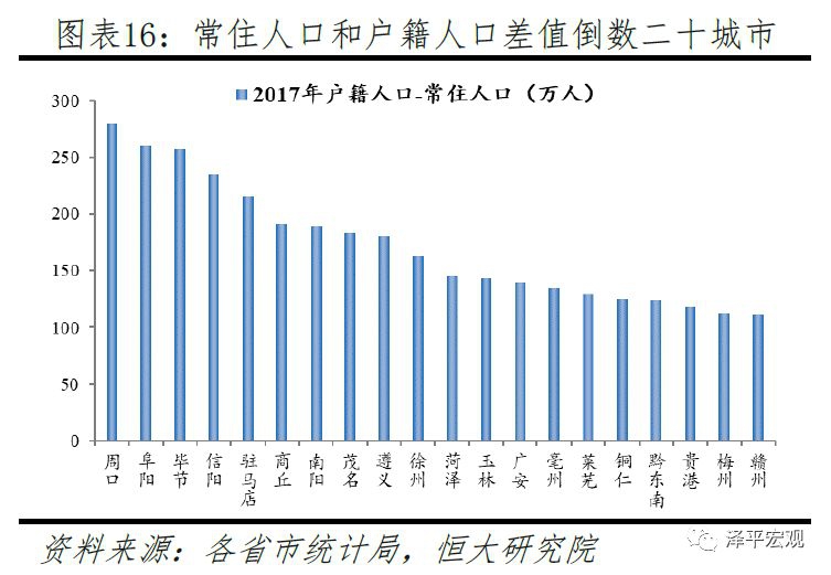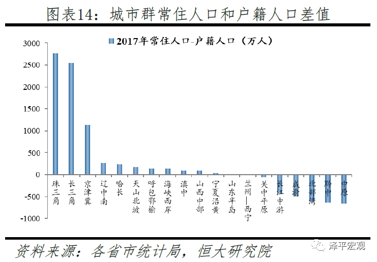 分线城市看,2017年一线、二线、三四线城市常住人口与户籍人口的差值约为3134万人、4991万人、-7717万人。经济发达地区凭借良好的就业机会和优质的公共资源,吸引大量区外人口就业和居住。