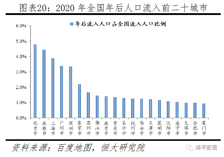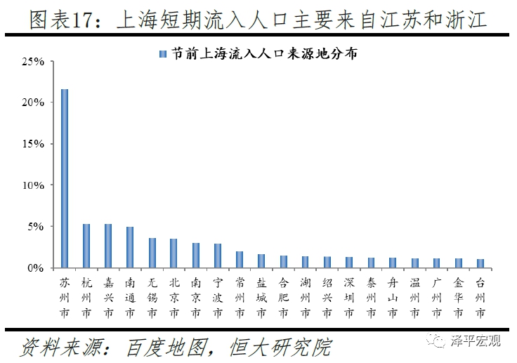 分城市来看,上海、深圳、北京、东莞、广州常住人口与户籍人口的差值均超500万,居全国前五,这些城市主要分布在珠三角、长三角、京津冀等城市群,三大城市群常住人口与户籍人口的差值分别为2766、2542、1131万人。周口、阜阳、毕节、信阳、驻马店、商丘常住人口与户籍人口的差值均小于-200万人,居全国倒数前五。并且,城市群内部人口流动频繁,比如在长三角城市群,根据包括短期人口流动统计的百度地图迁徙大数据,2020年春节前(1月10日至24日)上海市流入人口(含中转)中约63%来自江苏和浙江,其中苏州、杭州、嘉兴、南通、无锡居前五位,合计占比达41%;南京、苏州流入人口(含中转)主要来自安徽省和苏北地区,而杭州、宁波主要来自浙南地区。