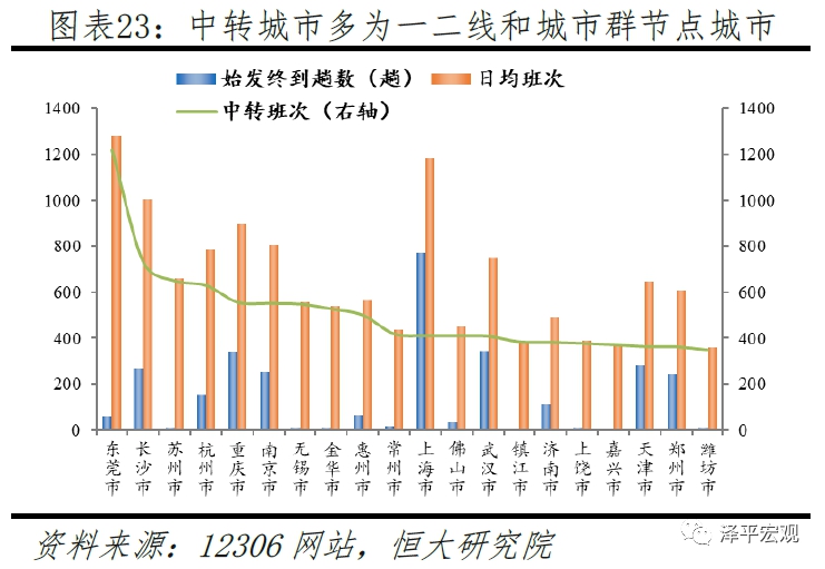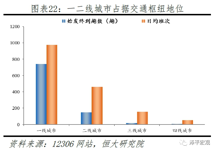 根据12306网站数据,从高铁日始发终到趟数看,一线、二线、三线、四线城市分别平均为740、149、17、6趟,其中广州、上海、北京、深圳、成都、武汉、重庆、天津、长沙、西安位居全国前十。从高铁日均通行班次看,一线、二线、三线、四线城市分别为974、460、155、54趟,其中东莞、上海、广州、长沙、深圳、重庆、成都、南京、杭州、武汉位居全国前十。从高铁中转班次看,一线、二线、三线、四线城市分别为254、311、138、48趟,东莞、长沙、苏州、杭州、重庆、南京、无锡、金华、惠州、常州位居全国前十,除一二线城市外,金华、惠州、常州等城市群内节点城市得益于发达的城际高铁成为热门中转城市。