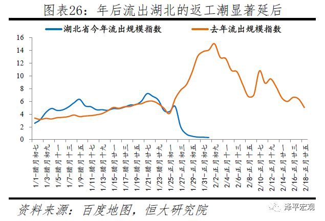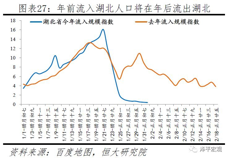 根据百度迁移大数据,2019年正月初一开始出现返工现象,返工人数逐日上升,正月初九达到返工高峰。但由于湖北地区疫情严重,湖北17地陆续在2020年1月23至26日封城,1月26日后从湖北流出的人口规模呈迅速下降趋势。但随着疫情稳定、封城解除,大量湖北人口将陆续返工。