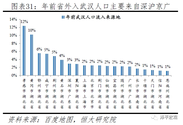 但武汉是全国主要交通枢纽,大量人口从武汉中转,因此途径武汉外流的人口流向也值得关注。根据百度地图迁徙大数据,从省级层面看,年前流入武汉的人口中59.1%来自湖北,21.9%来自广东、河南、浙江、江苏、湖南等5省;从地级层面看,年前流入武汉的人口中57.9%来自同省的孝感、黄冈、鄂州、咸宁等14城,12.7%来自省外的深圳、上海、北京、广州、长沙、信阳等6城。