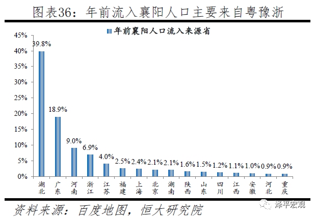 襄阳:未来返工人口约40%将流向湖北其他城市,41%将流向广东、河南、浙江、江苏、福建等5省,33%流向深圳、南阳、东莞等13个湖北省外城市。根据百度地图迁徙大数据,从省级层面看,年前流入襄阳的人口中39.8%来自湖北,41.4%来自广东、河南、浙江、江苏、福建等5省;从地级层面看,年前流入襄阳的人口中36.7%来自同省的武汉、十堰、随州、荆门等7城,33.2%来自省外的深圳、南阳、东莞、广州等13城。