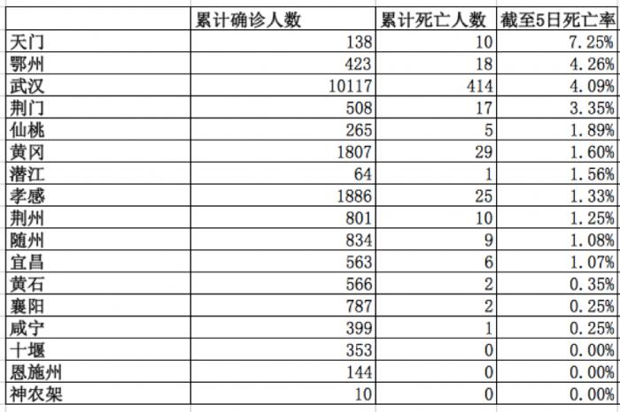 不过截至4日24时,天门、鄂州死亡率分别高达7.81%和4.71%。由于4日当日两地无人死亡,因此拉低了当地死亡率。