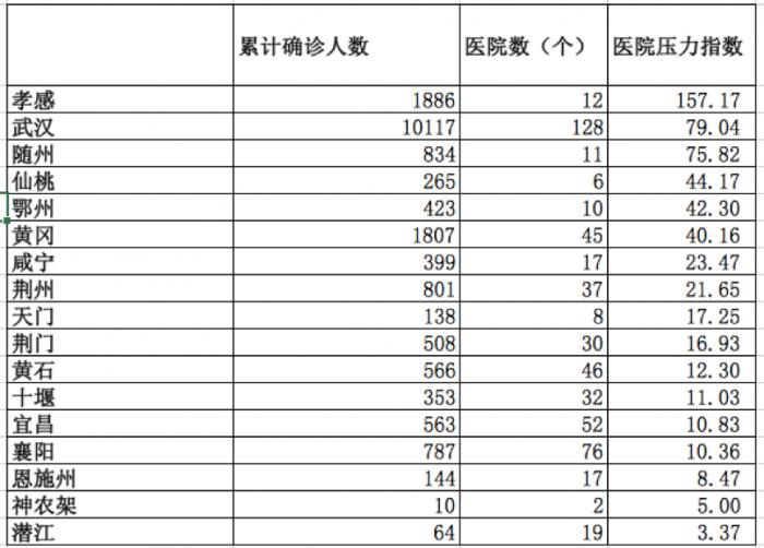 当前各市内卫生医疗机构多样,包括医院、社区卫生服务中心、卫生院、疾病控制中心、采供血机构、急救中心等,其中具备肺炎救治功能的仍以医院为主。21世纪经济报道记者根据湖北省卫健委数据测算,当前孝感超越武汉,成为医院压力最大的城市,压力指数高达157.17。