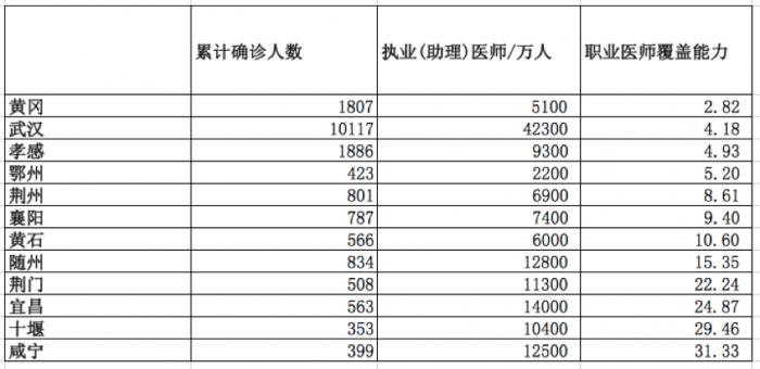 根据2019湖北省统计年鉴公布的数据(未单列天门数据)测算,截至5日,本次疫情中职业医师压力最大的是黄冈,覆盖能力指数仅2.82。