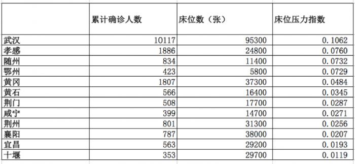 此外,孝感、随州因床位数与确诊人数成反比,床位也面临较大压力,分别为0.0760和0.0732。