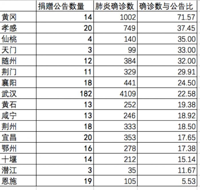 从截至2月2日确诊数与捐赠公告的比例来看,黄冈市受赠物资公告比例相对较小,平均超过71个确诊病例才收获1个物资公告。孝感、仙桃、天门、随州的受赠物资同样不敌其他城市,比例徘徊在32至38之间。