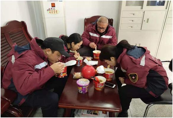 △蒋金波(中间)和同事在工作间隙吃泡面