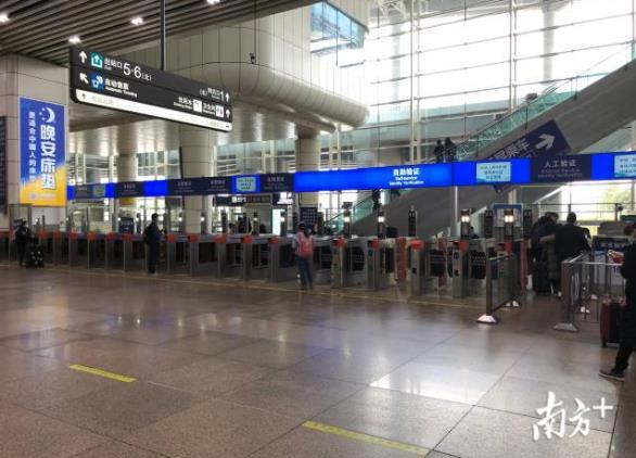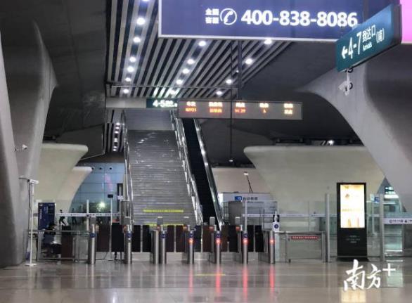 地铁H口空无一人,再走进广州南站地铁站里,以前需要排起长龙等候安检的安检口,现在也无需排队了。
