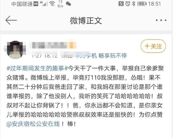 无独有偶,安徽宿松一位女孩担心父亲安全,在微博上向公安举报自己父亲聚众打麻将。@安庆宿松公安在线 接消息后,十几分钟就解决了问题。女孩事后还发帖调侃:“爸,你永远不会知道是你亲女儿举报的”。