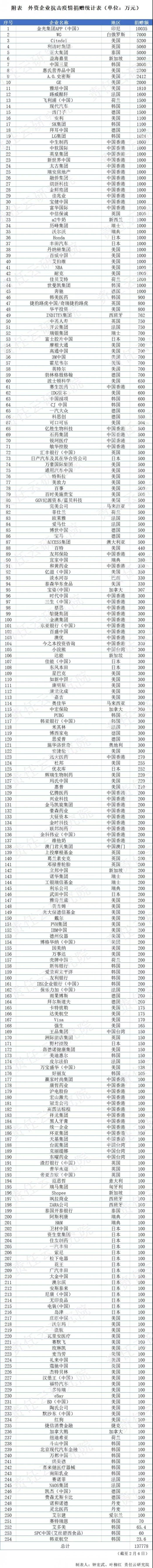 截至2020年2月6日,254家外资企业累计捐赠13.78亿元现金及物资。
