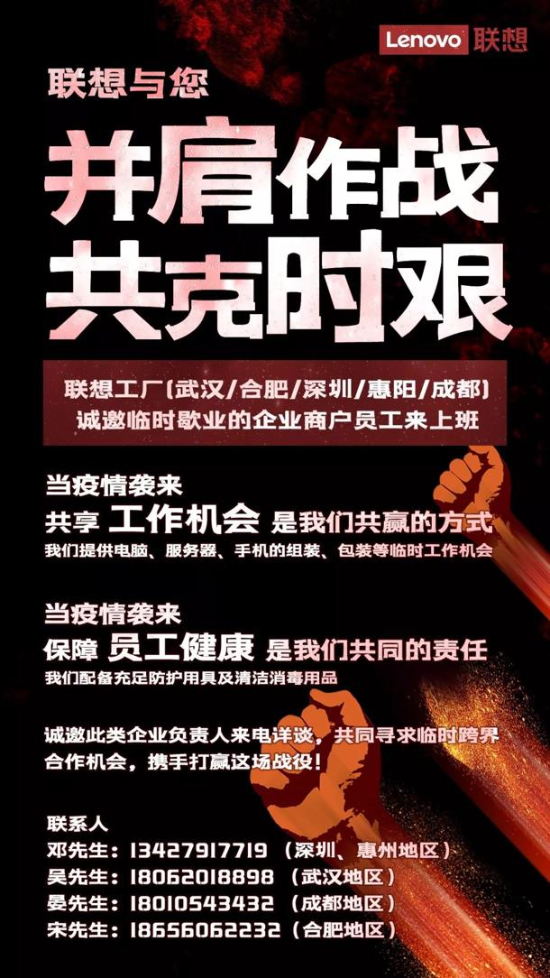 2月8日消息,联想集团今日宣布,将提供短期工作机会,帮助中小企业扛过困难期。