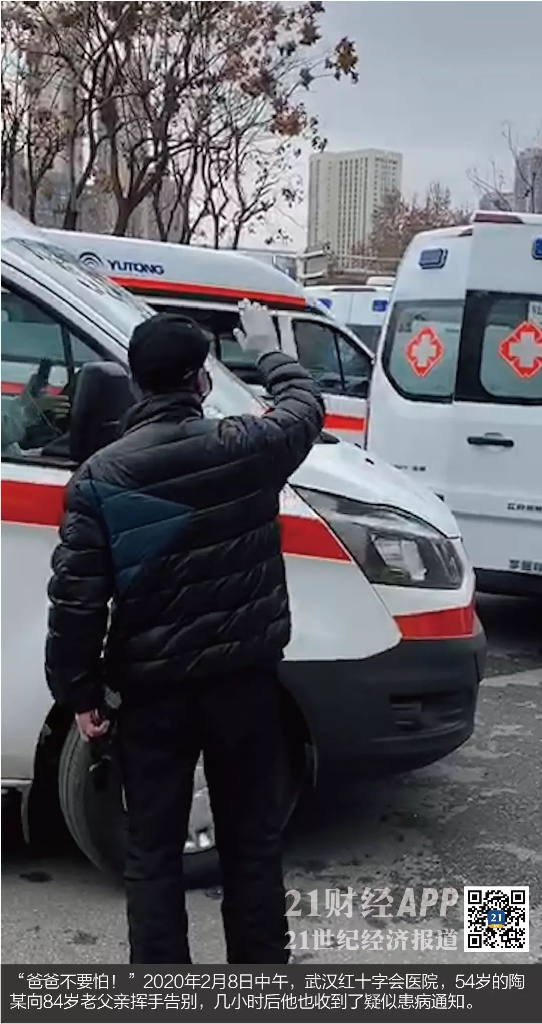 2月8日上午,在武汉红十字会医院门口,一批新型冠状病毒肺炎患者被送往火神山医院。临行前,陶先生追到84岁父亲乘坐的医护车前,医护阻拦不能靠近,他只能在远处对着父亲大喊——“不要怕,不要怕”。