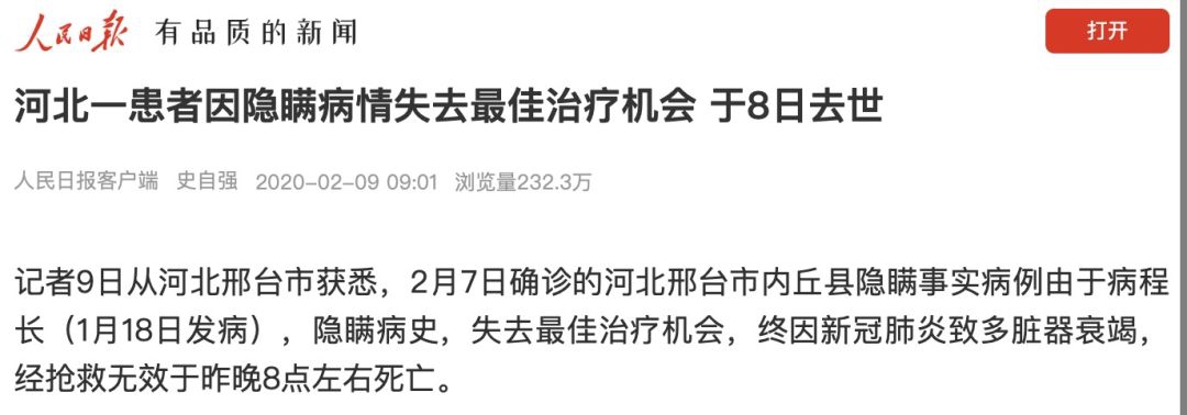 失去最佳治疗机会去世 人民日报记者9日从河北邢台市获悉,2月7日确诊的河北邢台市内丘县隐瞒事实病例由于病程长(1月18日发病),隐瞒病史,失去最佳治疗机会,终因新冠肺炎致多脏器衰竭,经抢救无效于昨晚8点左右死亡。