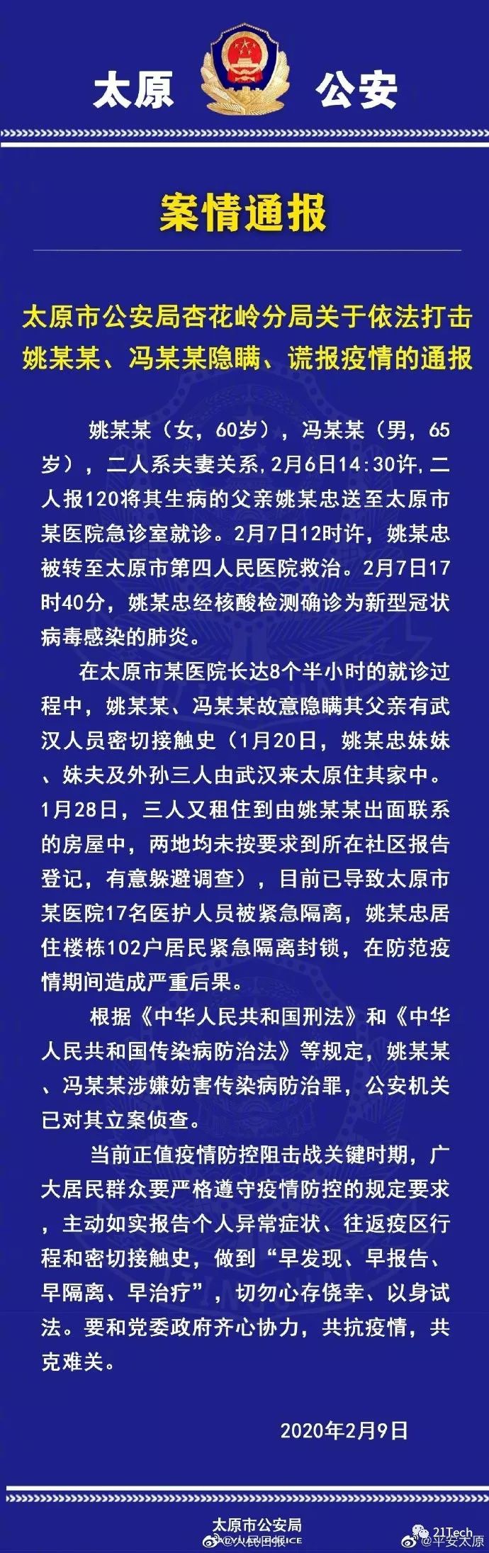 2月6日,太原警方通报,姚某某(女,60岁),冯某某(男,65岁)夫妻二人同其父亲姚某忠在太原市某医院8个半小时的就诊中,故意隐瞒其父亲有武汉人员密切接触史。7日,姚某忠确诊患新冠肺炎。目前已导致太原市某医院17名医护人员被紧急隔离,姚某忠居住楼栋102户居民紧急隔离封锁,在防范疫情期间造成严重后果。根据《中华人民共和国刑法》和《中华人民共和国传染病防治法》等规定,姚某某、冯某某涉嫌妨害传染病防治罪,公安机关已对其立案侦查。