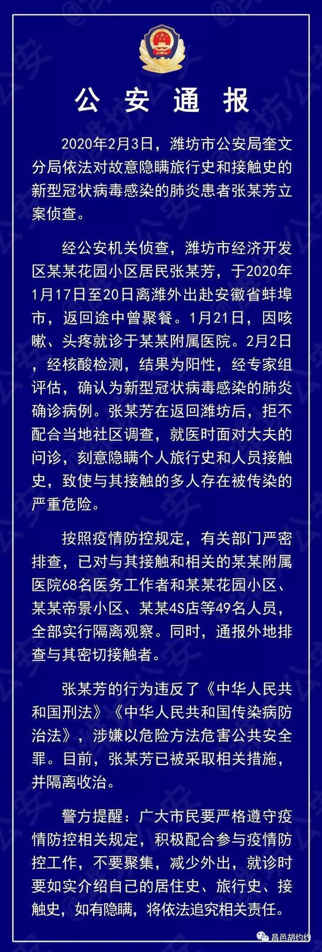 潍坊 2月5日,山东潍坊市公安机关发布通报称,2020年2月3日,潍坊市公安局奎文分局依法对故意隐瞒旅行史和接触史的新型冠状病毒感染的肺炎患者张某芳立案侦查。 经公安机关侦查,潍坊市经济开发区某某花园小区居民张某芳,于2020年1月17日至20日离潍外出赴安徽省蚌埠市,返回途中曾聚餐。1月21日,因咳嗽、头疼就诊于某某附属医院。2月2日,经核酸检测,结果为阳性,经专家组评估,确认为新型冠状病毒感染的肺炎确诊病例。张某芳在返回潍坊后,拒不配合当地社区调查,就医时面对大夫的问诊,刻意隐瞒个人旅行史和人员接触史,致使与其接触的多人存在被传染的严重危险。