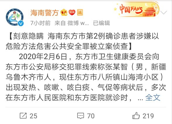长春 2月4日,长春公安通报称,对王某某(男,50岁,已确诊为新型冠状病毒感染的肺炎病例并送至指定医院医治)涉嫌以危险方法危害公共安全罪立案侦查。 王某某系武汉某医药公司职工,1月19日回长探亲后,未向社区报备,不主动居家隔离,在其出现发热咳嗽等症状3次就医时,故意隐瞒在重点疫区工作生活经历和返长行程事实,欺骗就诊医生,且多次主动与他人密切接触、就餐,导致5人直接感染、多人封闭隔离观察,造成严重后果。 海南 2月6日,海南警方通报称,犯罪嫌疑人张某智在出现感染症状后,多次前往东方市人民医院、东方医院就诊时,刻意隐瞒其密切接触从湖北武汉到东方市居住的姐姐、姐夫等情况,并多次在输液时往地上吐口水,与医护人员发生争吵。1月29日其乘坐动车前往海口到海南省人民医院检查,后被海南省人民医院确诊为感染了新型冠状病毒肺炎。 张某智的行为导致多名医护人员及其密切接触人员封闭隔离观察,且八所镇山海湾整个小区已封闭式管理,造成严重后果。