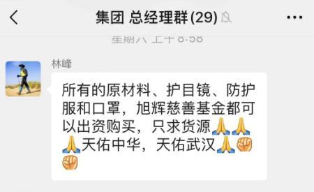 在朋友圈官宣这一消息后,旭辉控股总裁林峰开始在集团总经理群里发出动员:“所有的原材料、护目镜、防护服和口罩,旭辉抗击肺炎专项基金可以出资购买,只求货源。”