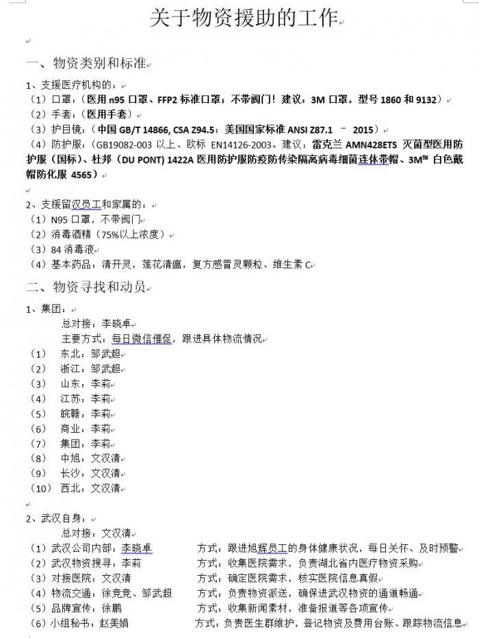 在疫情早期,旭辉武汉的工作小组就出台了《物资援助工作指引》。也正是这份指引明确规定了物资类别和标准、人员分工、采购流程、对口医院、运输方式、确认方式等,确保了工作井然有序地开展。