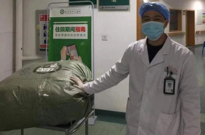 在武汉负责物资运输和分发的同事和医生,为了保证物资交接高效,又考虑到自身防护,披上一件雨衣就上阵搬运了。