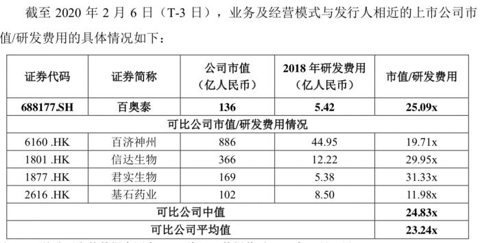 在第一家未盈利企业泽璟生物首次采用了“市值/研发费用”的可比估值指标之后,百奥泰作为第二家未盈利企业,同样选择披露“市值/研发费用”作为估值指标。