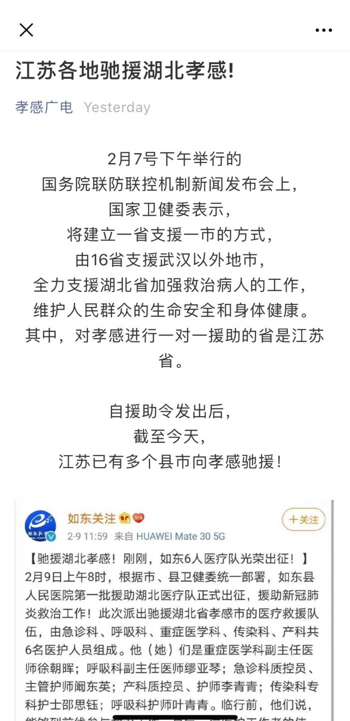 但据“孝感广电”公众号,此前已有“江苏各地驰援湖北孝感”的报道: