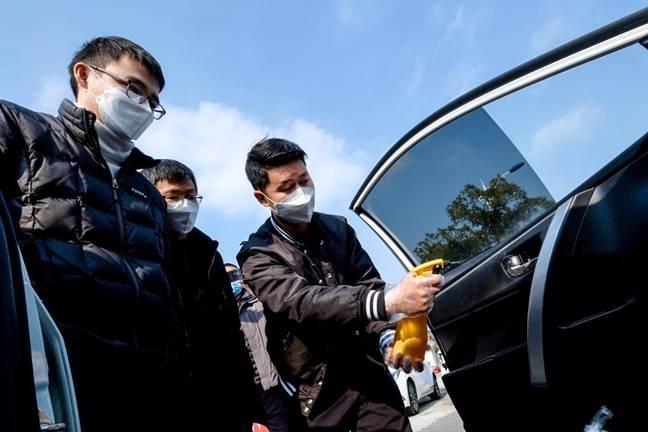 (滴滴司机正在对车内进行消毒)
