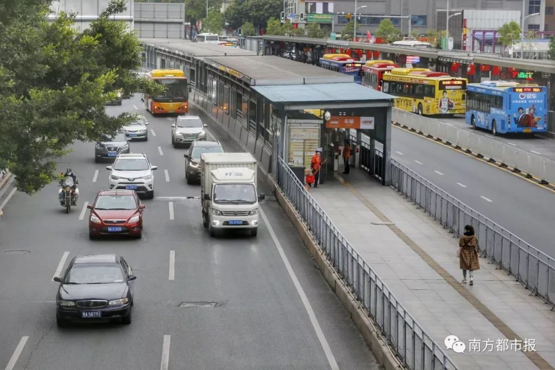 上午8时,广州中山大道西,BRT站台上等车的市民并不多,BRT的班次多了,其他车道上的车流明显增多。