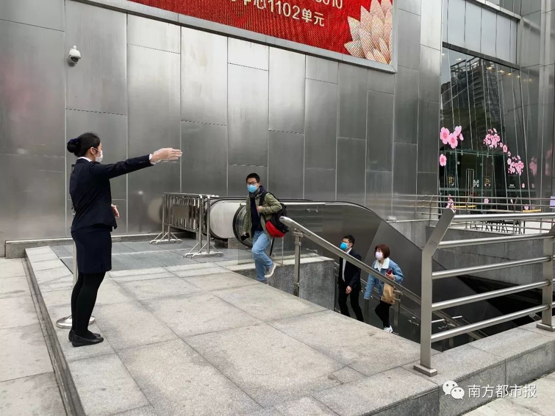上午8点29分,珠江新城站C出口,往盈凯广场方向。一出站口,有盈凯广场的工作人员指引去测体温区做登记。