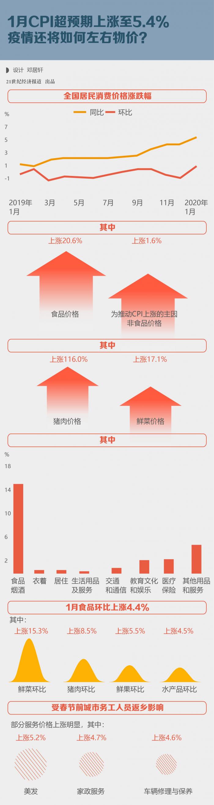 “去年由于猪肉、日常生活消费品等带来结构性通胀,由于价格惯性以及春节因素,CPI还会继续走高。1月CPI同比上涨5.4%,上涨幅度之所以比预期要大一些,是叠加了新的疫情因素”,2月10日,中国政策科学研究会经济政策委员会副主任徐洪才对21世纪经济报道记者表示。
