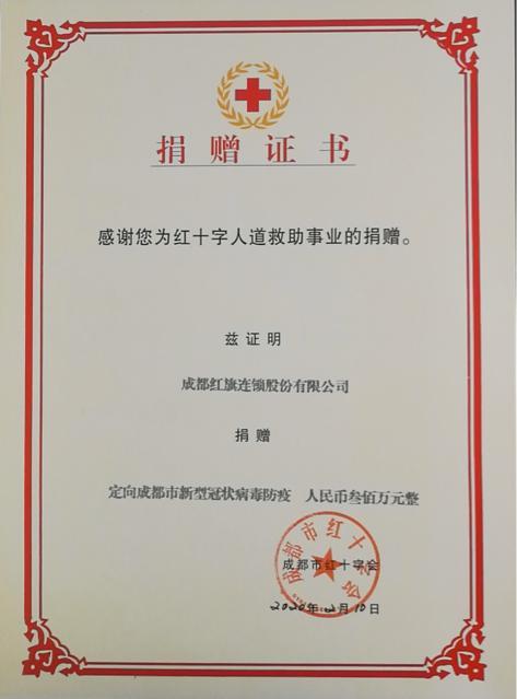 为应对新型冠状病毒感染的肺炎疫情,积极履行企业社会责任,支援抗击新冠肺炎疫情工作,2月10日,红旗连锁通过成都市红十字会捐赠300万元,专项用于成都市新冠肺炎疫情防控工作。