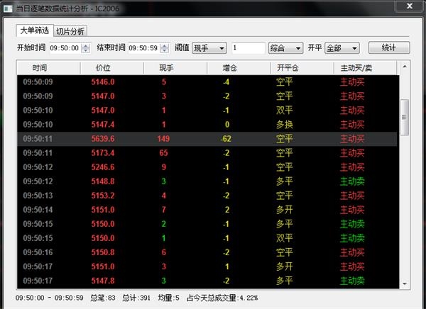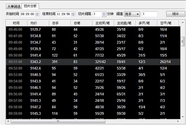 数据显示,09:51,一分钟内主动买一共是42笔321手,主动卖是41笔70手,多头开3笔12手,空头平14笔262手。一分钟成交391手,成交均价5343.2点。